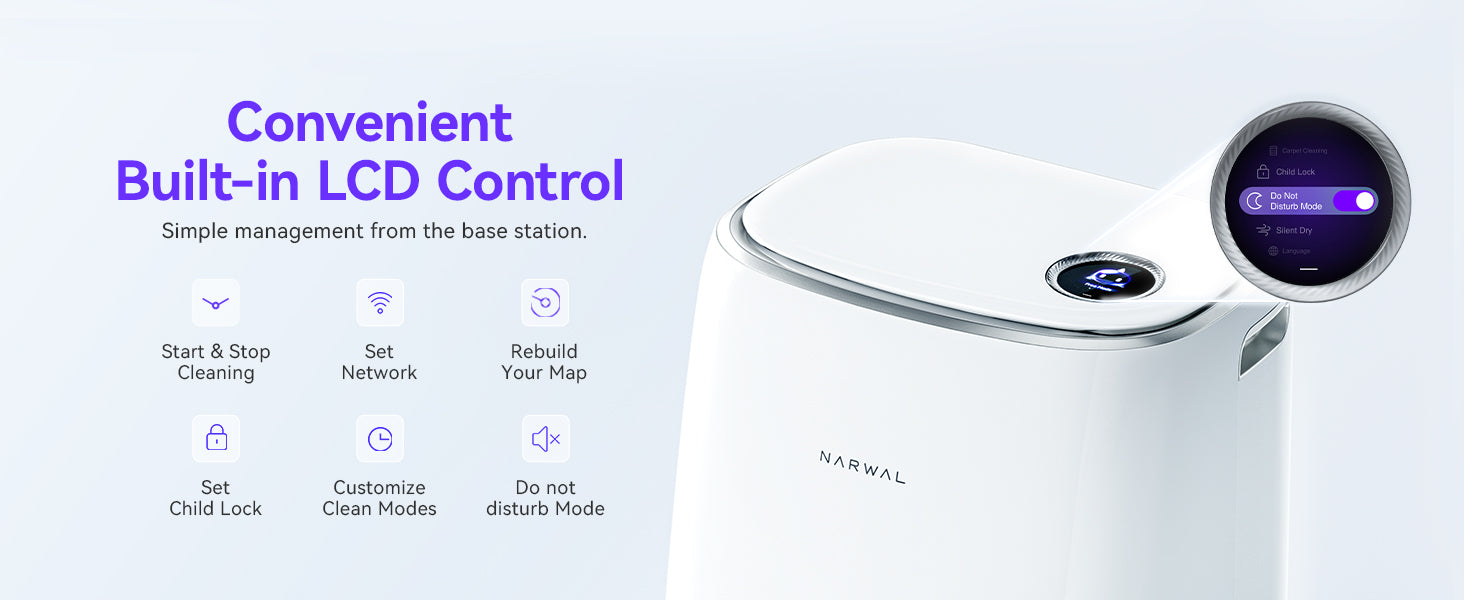 NARWAL Freo Robot Vacuum and Mop Comb, Washing & Drying, Dirt Sense Ultra Clean, Auto Add Cleaner, LCD Display, Smart Swing, Arcuate-Route, WiFi, APP Control, White